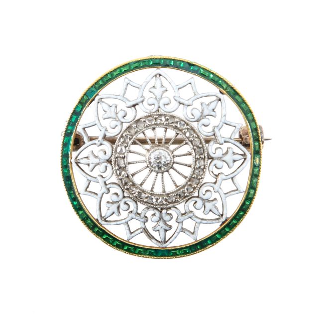 early 20th century, of circular form, with pierced white enamel surrounded by green enamel border, the centre set with circular cut diamond millegrain set surrounded by an outer circle of smaller diamonds