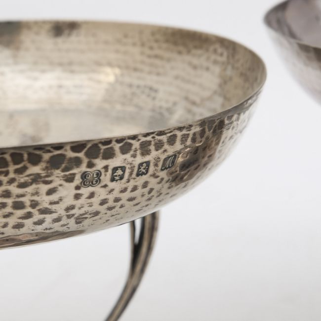 by George Edward & Sons, Glasgow 1909, the planished circular bowls, raised on curved supports, to a domed base (2)