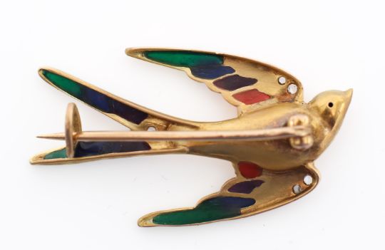 the bird engraved with feather detail to body, rose cut detail, faceted ruby eye and plique-a-jour detail to feathers and dial, 18ct stamp to reverse