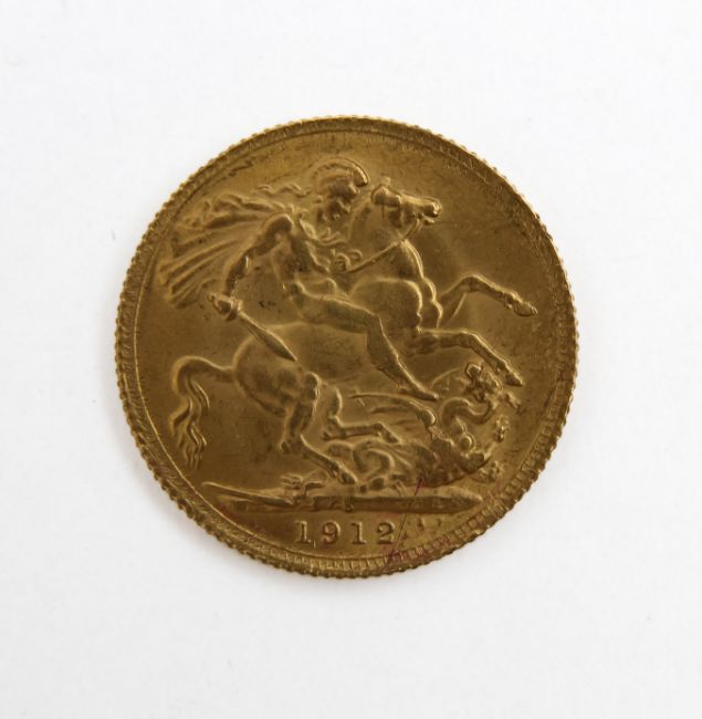 A George V full sovereign 1912with King George facing left and Saint George slaying and the dragon to reverseCondition: Good conditionDimensions: weight 7.99g