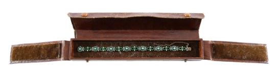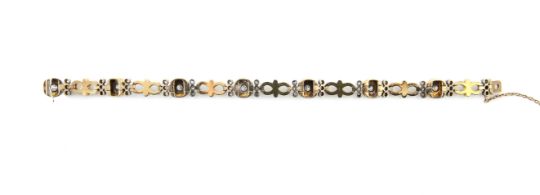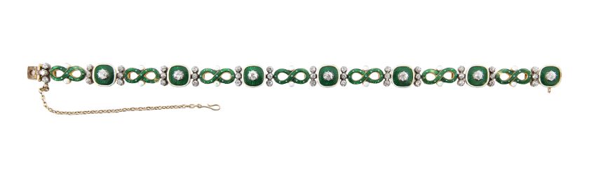 late 19th century, in the manner of Giuliano, composed of alternating yellow gold shaped square and figure-of-eight links decorated with green guilloché enamel with white enamel detail, the square plaques with each claw-set to the centre with an old brilliant-cut diamond, with three old-cut diamonds to each side, concealed clasp