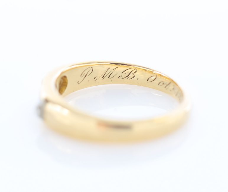 dated 1864, with stone deficient, old mine cut diamonds set into a band ring engraved with the words 'P.M.B. Oct 18th 1864'