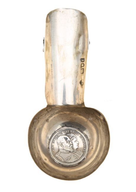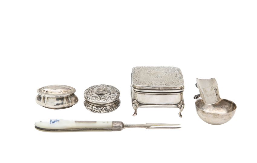 the boxes comprising a square form example Birmingham 1907, with a floral and foliate engraved lid, raised on cabriole legs, a circular example, Birmingham 1886, later decorated with the bust of Queen Victoria, and an oval example, Birmingham 1899, the mother of pearl fruit fork by Hilliard & Thomason, Birmingham 1891, with a blue engraved owl crest, and a cigar holder, inset with an Edward VII and Queen Alexandra coin (5)