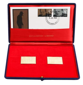 Two Metalimport limited edition Winston Churchill hallmarked 18ct gold replica stamp ingots in their original box, with certificate of guarantee, no. 1405, and first day stampsDimensions: width 4cm, weight 40.7 grams