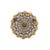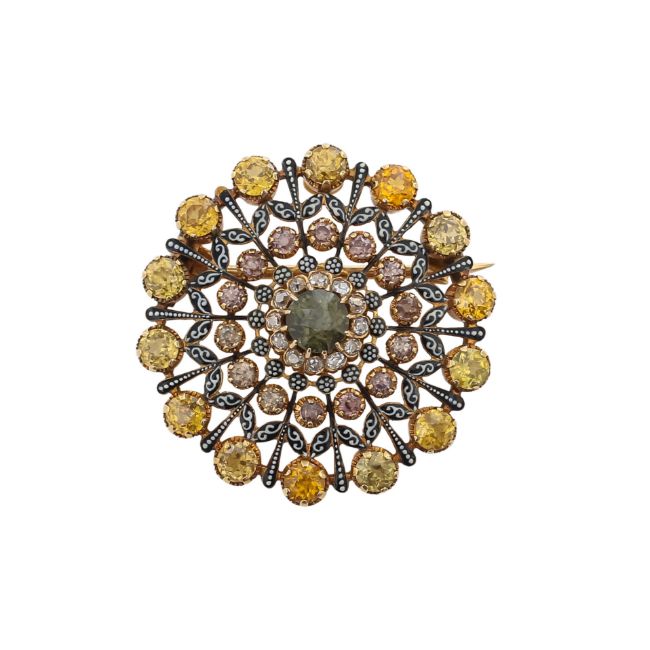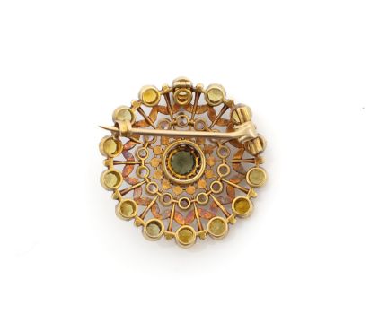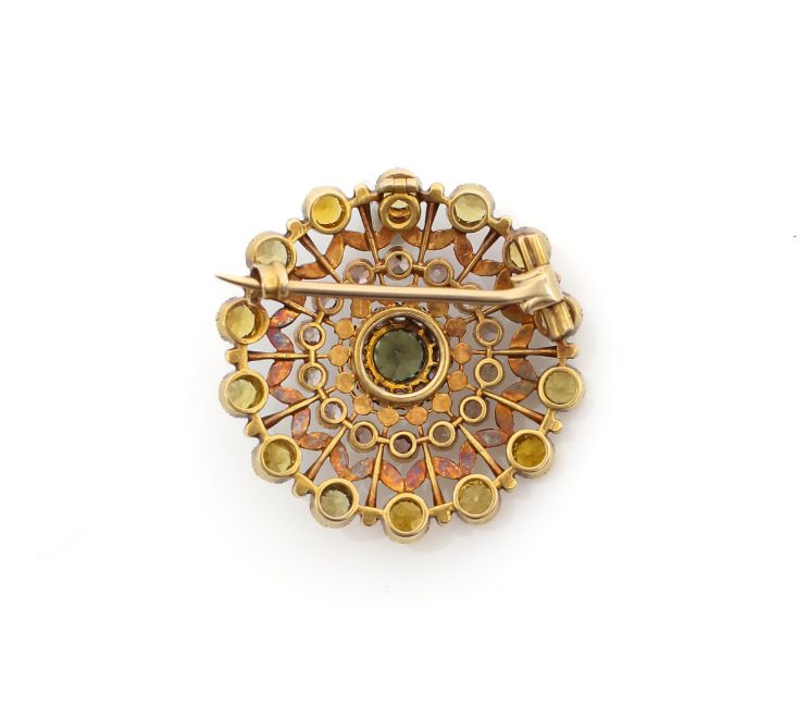 late 19th century, with green zircon set to the centre within a border of old cut diamonds, on an open work medallion with two concentric circles of yellow and brown zircons interspersed with black and white pique enamel in scroll and flower head patterns, mounted in gold, with pendant lop to reverse, makers initials to reverse C.G