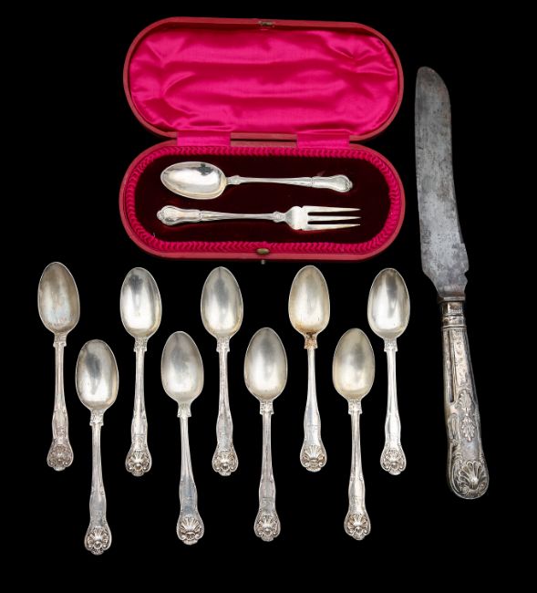 A set of eight Victorian silver teaspoons, a carving knife, and a cased George V silver Christening set