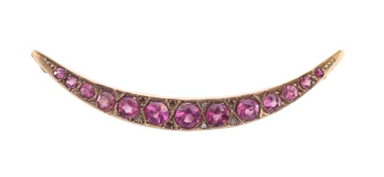 with thirteen pink graduated gemstones with eight small rose cut diamond detail (four deficient) collet with beading to reverse a curved pin and 'C' clasp with loop for safety chain