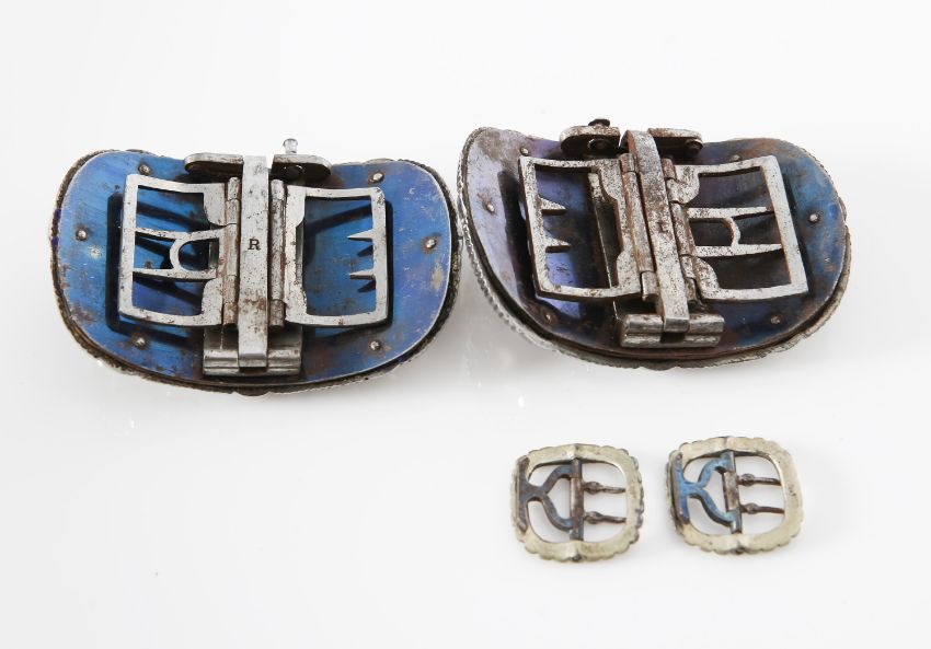 19th century, comprising a pair of cut steel and leather backed buckles, the reverse marked 'R' and 'L', and a miniature pair of cut steel buckles