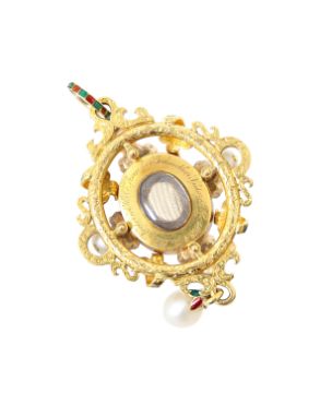 A Victorian Royal Presentation garnet, enamel, pearl, diamond and gold Holbeinesque pendant