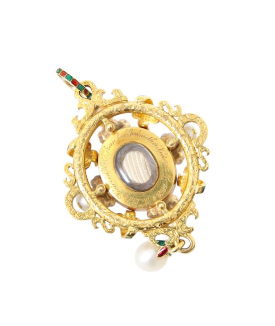the oval cabochon garnet set with rose-cut diamond-set three stone detail to the cardinal points, mounted on to a gold tubular frame set with four pearls interspersed with green and red enamel, the outer frame with royal blue enamel set to the edges, suspending a single pearl, with suspension loop enamelled in alternating red and green enamel, the reverse with fine decorative engraving and with a locket enclosing hair, the border with a presentation inscription reading "To Lady Victoria Hare from her Godmother Victoria R 1858"