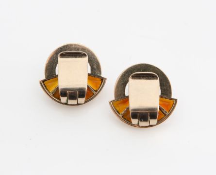 1950s, with 9ct hallmark 1955-56 London, golden sun rise set with a mixed cut citrine and five channel set trap cut citrine sun rays with clip backs