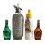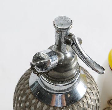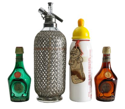 in white and yellow glass with plastic screw top, red printed titles and lettering, with original card label 'Armagnac B B Martine Gers'; together with two glass Benedictine in the form of half bottles; and a chrome and wirework soda syphon, early 20th century (4)