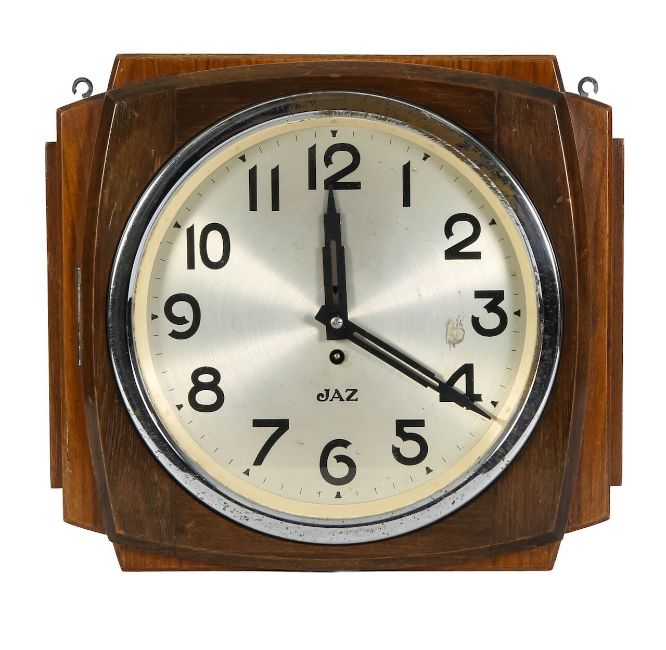 single train movement, silvered dial with Arabic numerals and batons, hinged front with chrome chapter ring, mahogany stylised casing, black painted metalliic bacl cpver