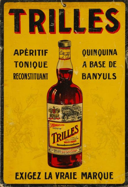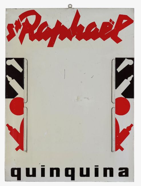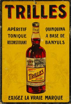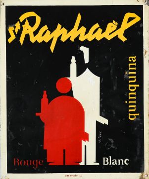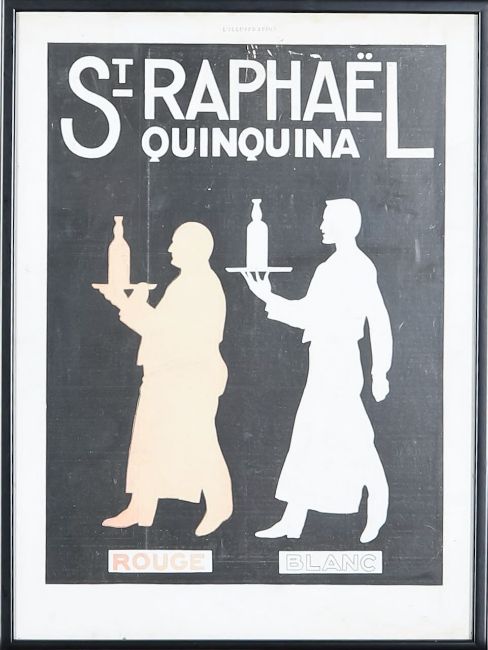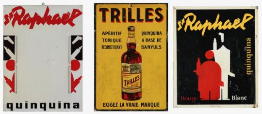 Mid 20th century, comprising signs for St Raphaël Quinquina (2/3 are tinplated signs, other framed print) and Trilles Quinquina (unframed print), each depicting figures and bottles in Art Deco style. (4)