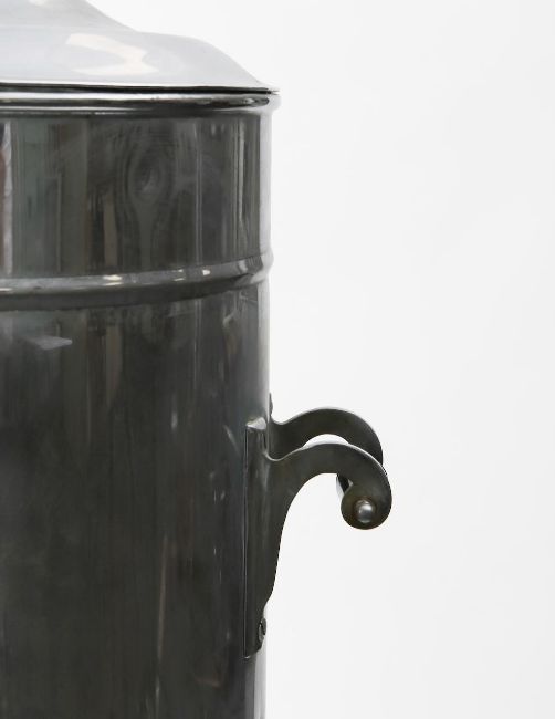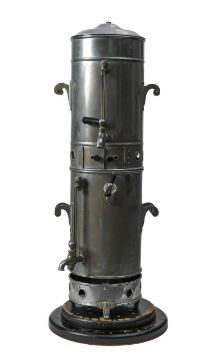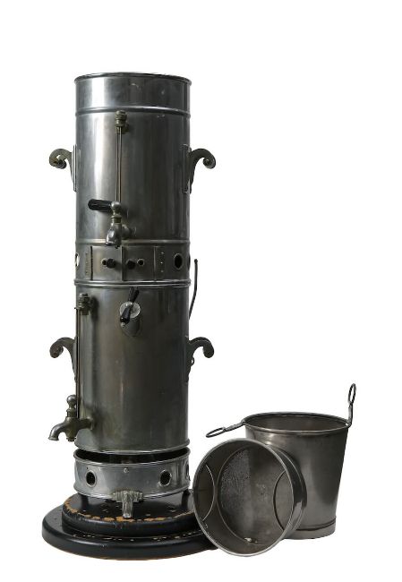 circa 1900-1920, in steel, of cylindrical form, lidded top, removable basket to interior, various piping and superstructure to exterior, in two sections, on black painted wooden base