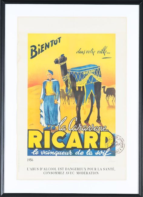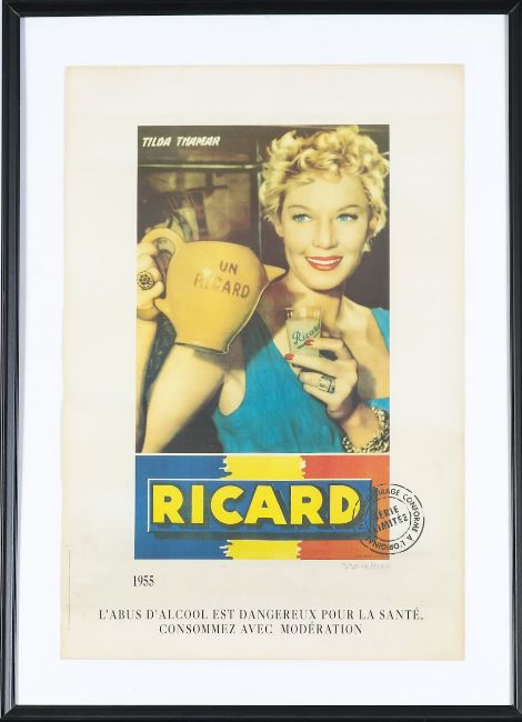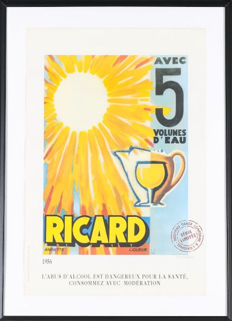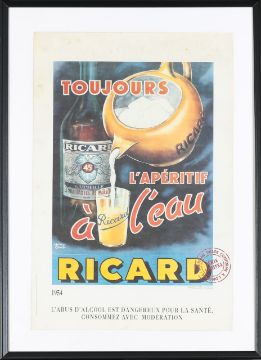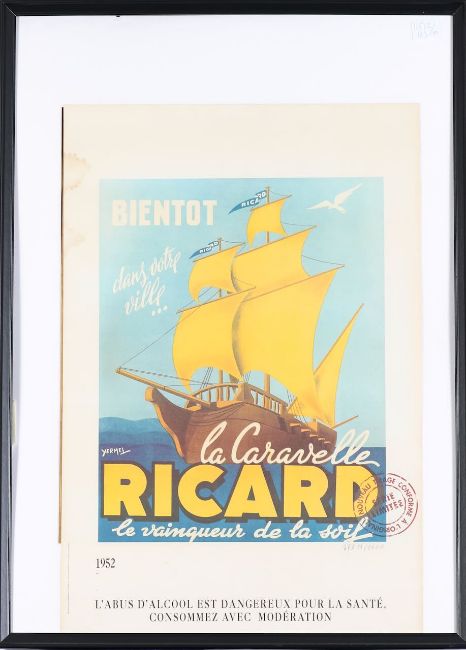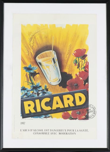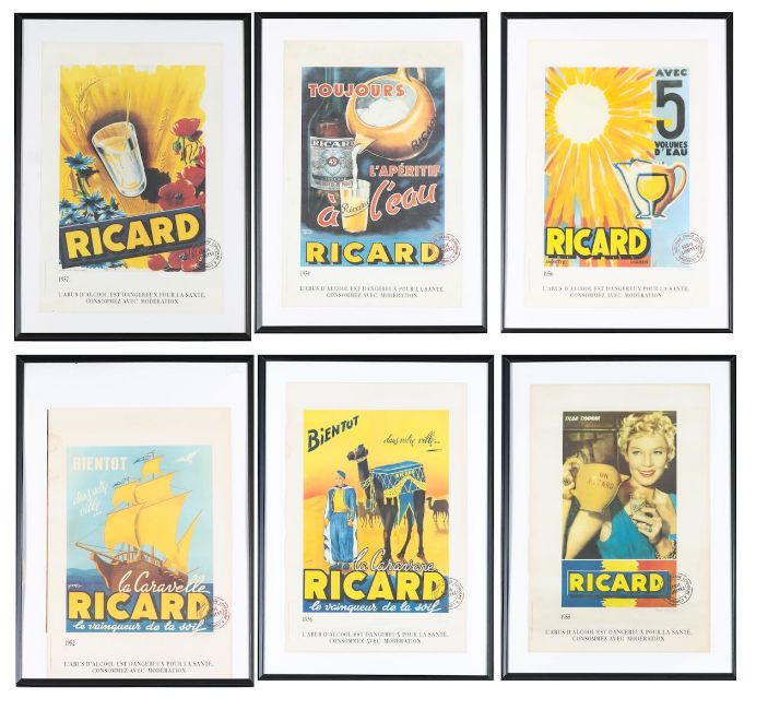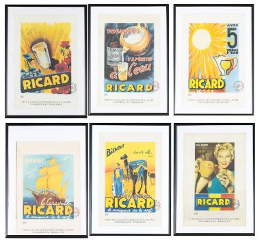 colour prints, the rectangular panels with Ricard logo in yellow, year of issue and health warning below, comprising 1952, 1954, 1955, 1956 x 2, 1957, in later plastic frames