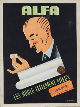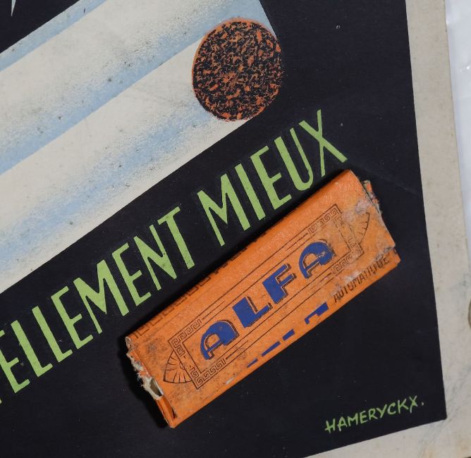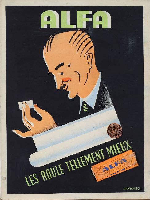 4) Alfa, Les Roule Tellement Mieux, cigarette papers packet stuck to poster, par Hameryckx, unframed but mounted. (4)