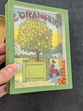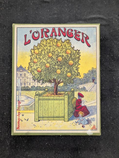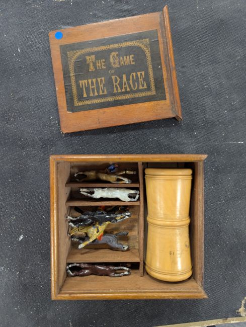 of square box form with original cover, with three concentric circular tracks with six painted horses, four silvered gate structure, embossed metal title plate to side with activation slide catch; together with French 20th century 'L/Oranger' boxed ball puzzle, lithographic cover and board; a Victorian 'The Game of the Race', wooden box with titled slide cover, the segmented interior with instructions, six painted lead horses and riders, turned wooden dice cup