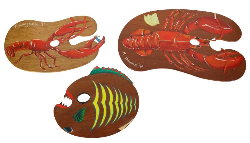 fret-cut plywood, painted and decorated with two lobsters, signed and dated '90, and a fish