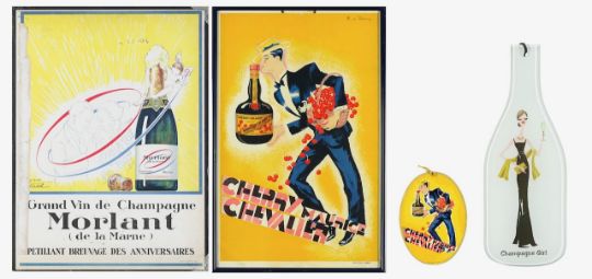 original framed and glazed print together with oval replica, named after the famous French entertainer Maurice Chevalier; together with 'Champagne Girl' glass bottle shaped hanging decoration and printed advert for 'Grand Vin de Champagne Morlant (de la Marne)' (4)