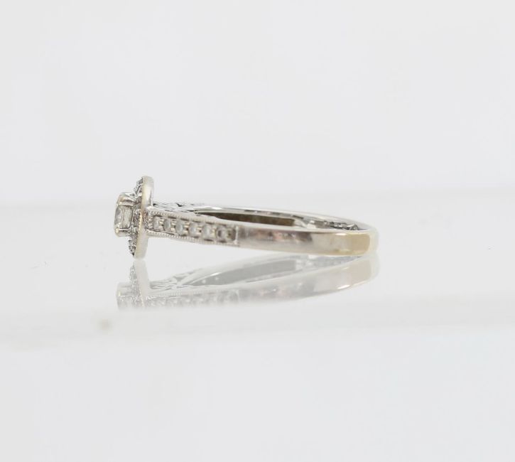 featuring a single stone, held in a claw setting with a halo and shoulder of grain set diamonds, milgrain detail, to the side scrollwork mount and a rectangle profile band, full 18ct hallmark