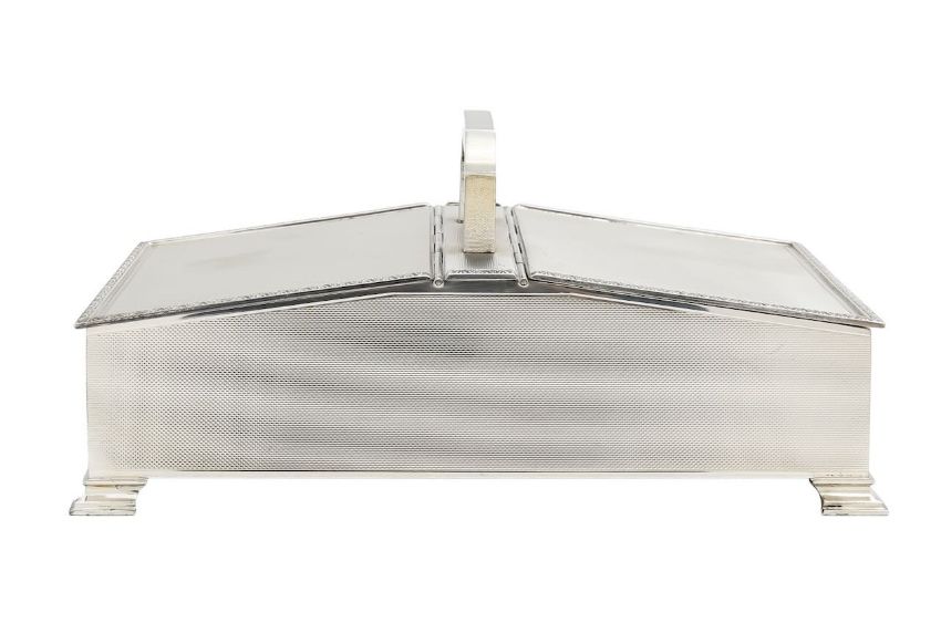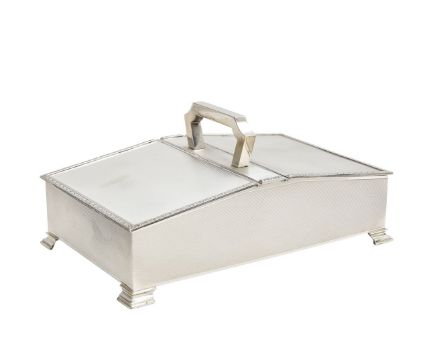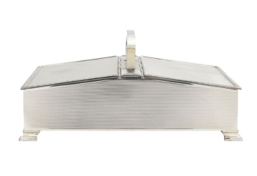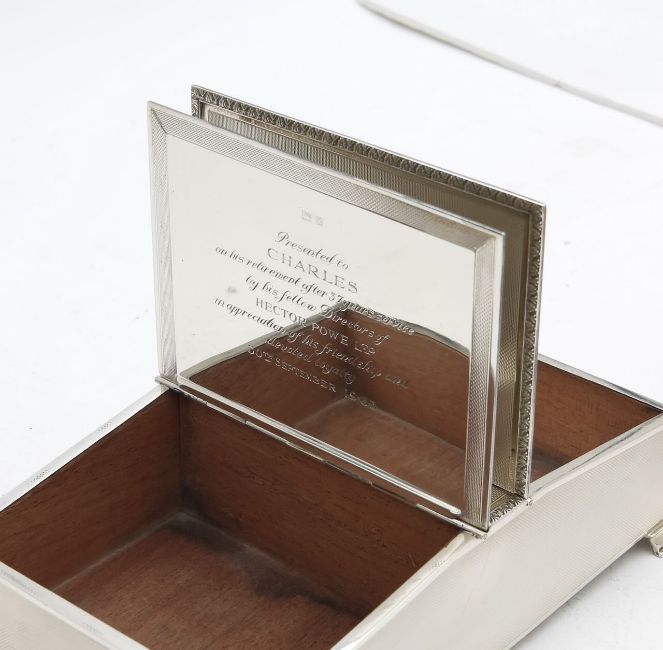 Birmingham 1962, with all over engine-turned decoration, to a bead and reel border, the compartment lids opening to reveal a wood-lined interior with a presentation inscription 'to Charles on his retirement'