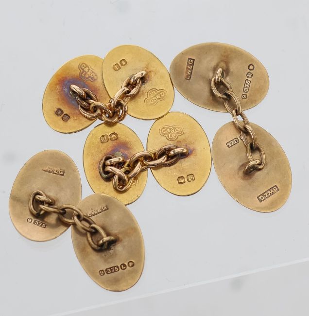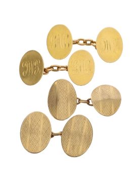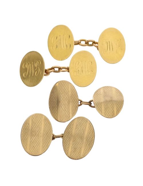 each comprising of two oval panels linked by chain, the 18ct pair with London marks Gold Smiths and Silversmiths Ltd and engraved initials and the 9ct pair with an engine turned pattern (2)