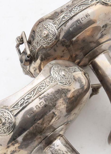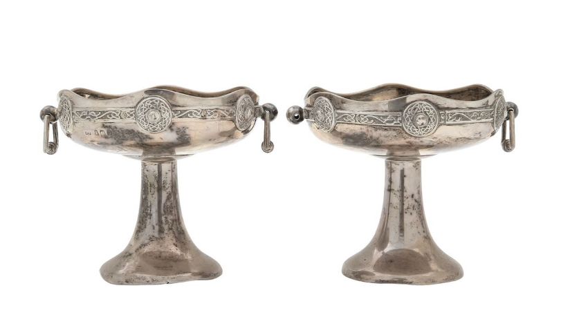 by Henry Matthews, Birmingham 1912, the circular bowl decorated a Celtic shield style border, raised on tapering stems and spreading circular bases (2)