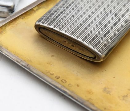 A group of silver and plated card cases, vestas and desk blotter