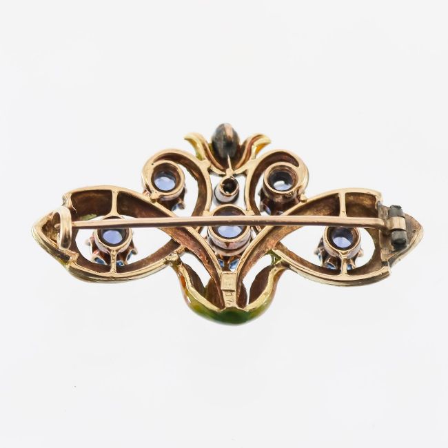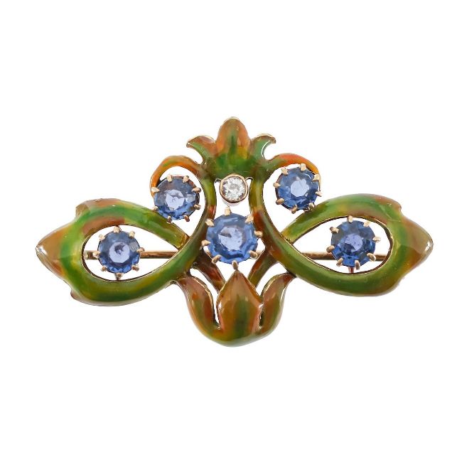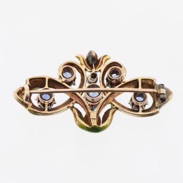 the openwork brooch with polychrome enamel entwined with blue mixed cut sapphires and a central bezel set diamond