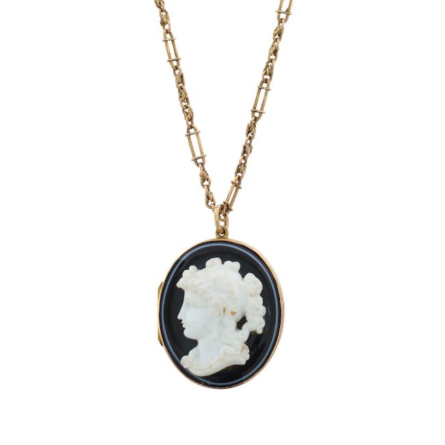 featuring a classically dressed lady facing left on banded agate mounted in a bezel setting, suspended from a long fancy link chain and swivel clasp