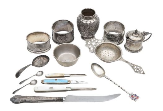 comprising two Chinese silver napkin rings, with Chinese character marks, relief decorated with a four clawed dragon, another oval napkin ring, Birmingham 1924, and Chinese characters, an miniature vase, possibly Indian, marked to the base, with floral and foliate decoration, a tea stainer on stand, Birmingham 1987, a Victorian drum form mustard pot, a George III caddy spoon, an enamel souvenir spoon, two mother of pearl fruit knives, and another blue guilloché enamel (qty.)
