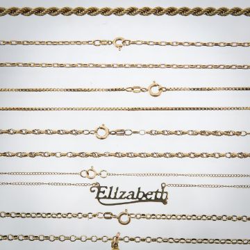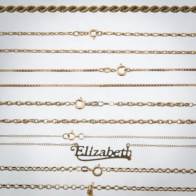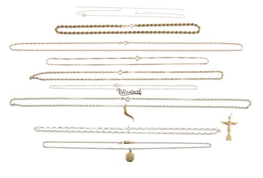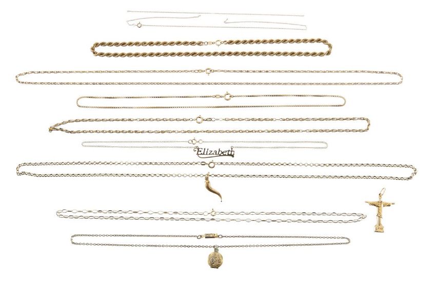 including a cross charm with 750 Rio stamp suspended from a 9ct diamond cut trace chain, a 9ct hallmarked plain belcher chain, one with horn of plenty charm, two 9ct rope twist chain, a box chain, pieces of a broken chain and a personalised necklace with the name Elizabeth (8)