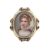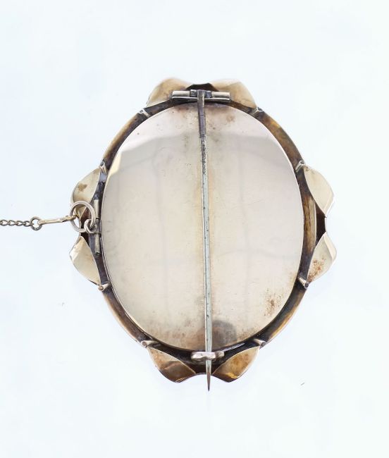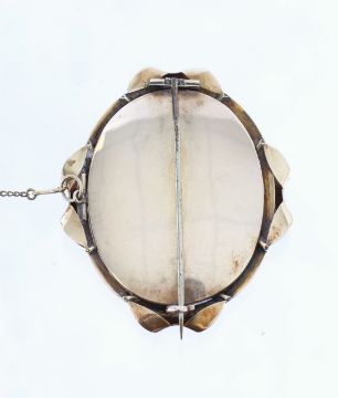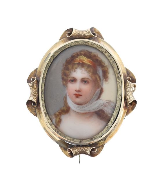 A Victorian portrait brooch of a ladyheld in a loose fitting decorative mount, featuring an elegant auburn haired woman wearing a yellow hair ribbon, and silk scarf, closed back setting with brooch pin clasp and safety chainDimensions: weight 29.1g size 6x5cmCondition: Good condition, brooch pin is vertical and made of base metal