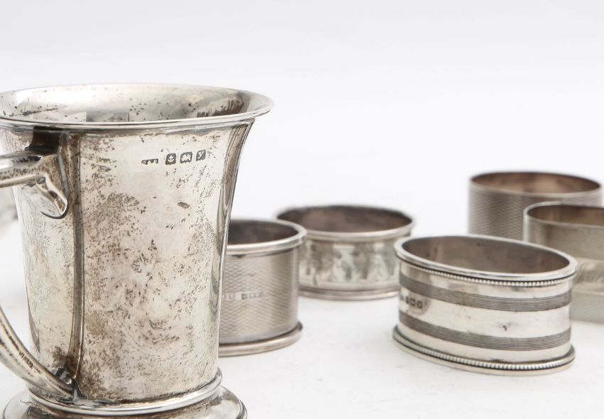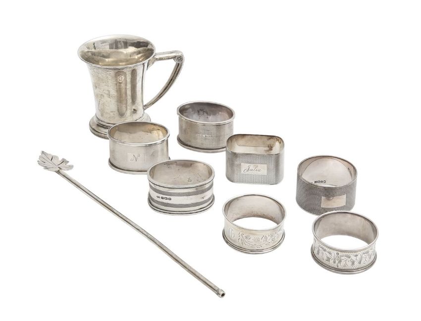 the napkin rings of various makers, dates and forms, with engine-turned and engraved decoration, the Christening mug, Birmingham 1923, with engraved initials, the cocktail stirrer marked 925, with a maple leaf form end (9)