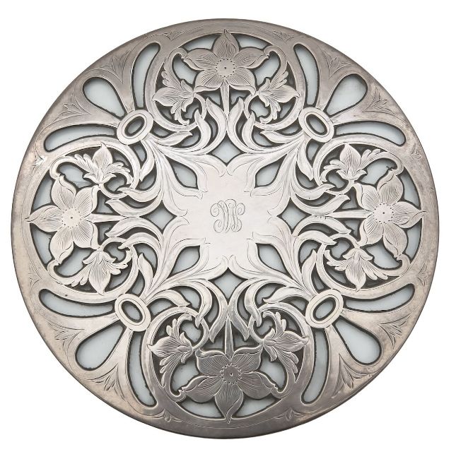 A Tiffany glass and silver mounted trivet tray,