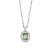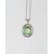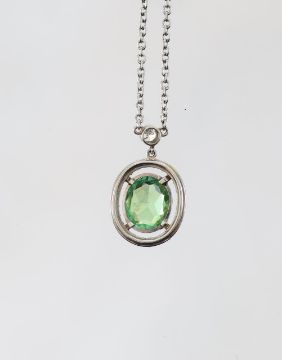 centrally set with an oval mixed cut green demantoid garnet surrounded with a halo of white brilliant cut diamonds, suspended from a single diamond set to a plain trace chain