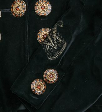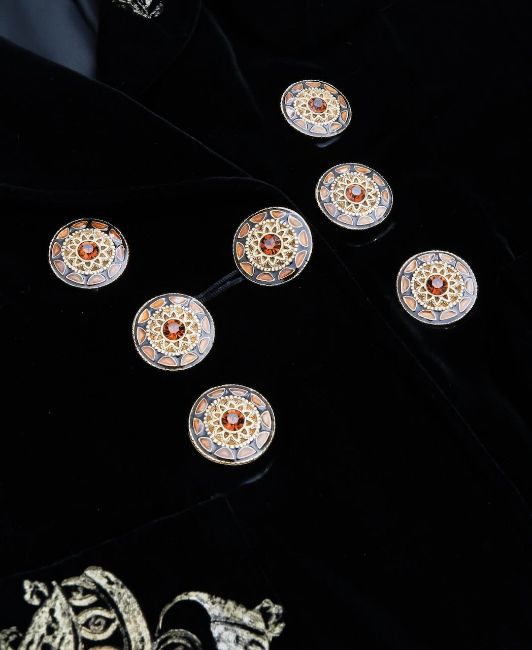 1980s, printed with Mediterranean motifs in gilt and trimmed with mauresque-style gilt buttons, labelled 'Christian Lacroix, Paris', size 44