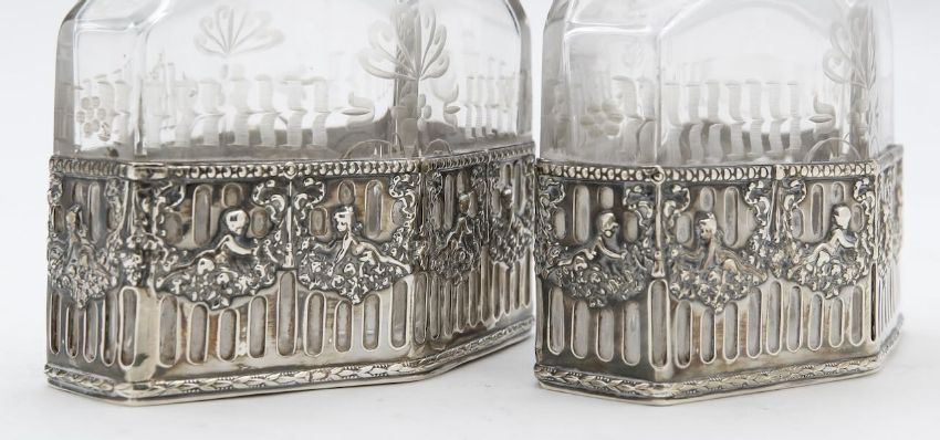 late 19th century, by B. Neresheimer & Söhne, and Thomas Stapleton, London import 1927, the silver mounted stoppers leading to a slender neck, and acid etched hexagonal body, in a pierced silver mount decorated with Classical style garlands (2)
