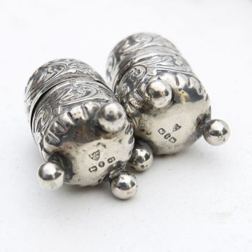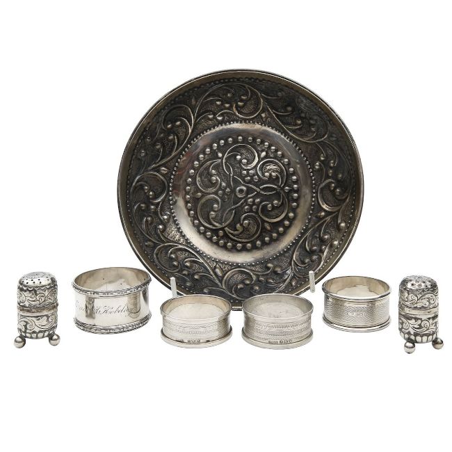 the bowl marked 925, with repoussé foliate decoration, the napkin rings of circular form, Birmingham 1930, 1942, and 1945, the pair of cruets by Haseler & Bill, Birmingham 1890 (7)