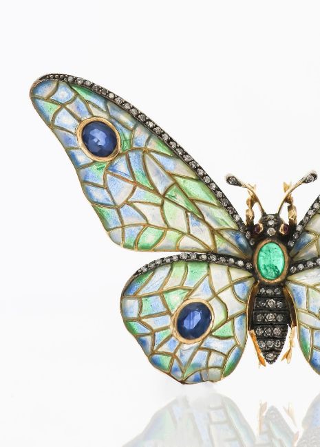 the graduated green and blue plique-à-jour enamel outstretched wings each set with an oval mixed-cut sapphire collet, and diamond-set detail to the edges, diamond-set antennae, head, and abdomen, cabochon ruby eyes, and an oval cabochon emerald collet thorax