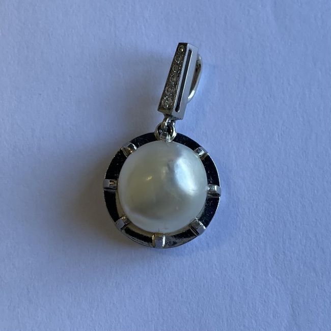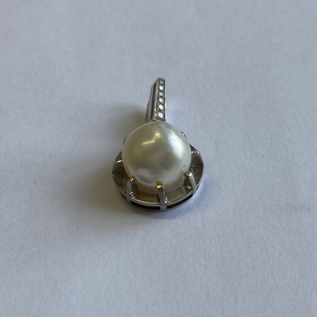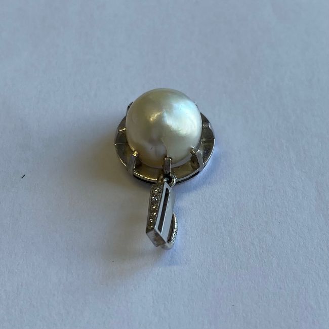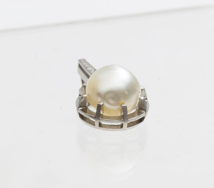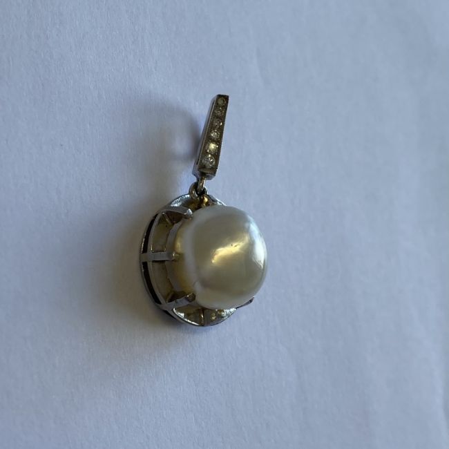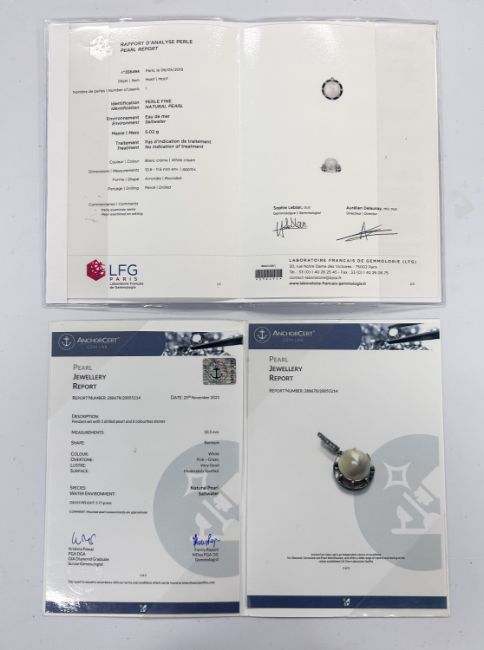 Condition: With wear commensurate to age, tested as platinum, with an anchor certificate for pearl, measuring 10.5mm, lustre very good, bail tested as 18ct and the pearl setting tested platinum. There is a small crack to the drill hole with claw, shown in image
