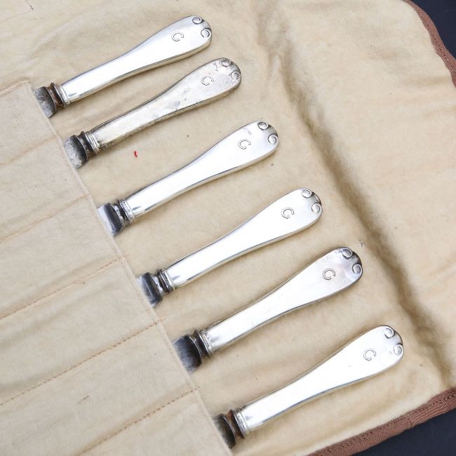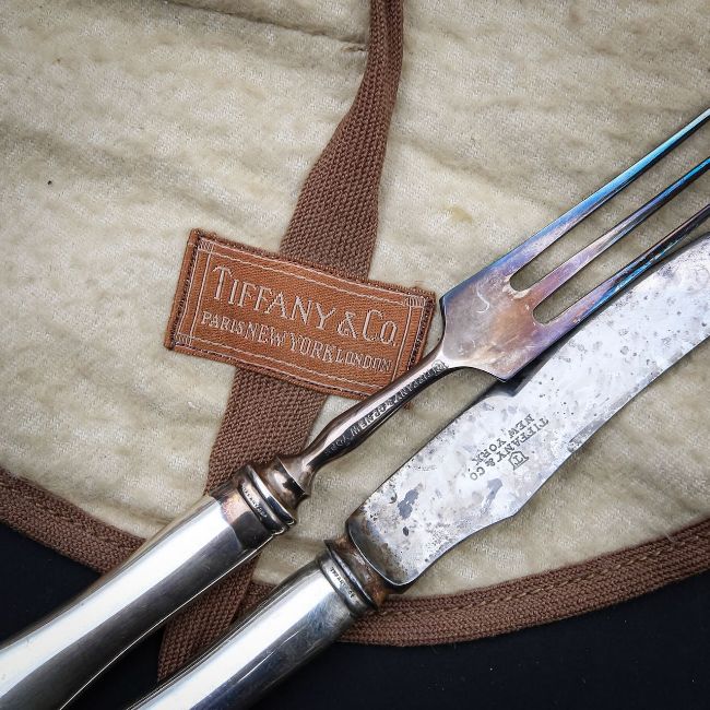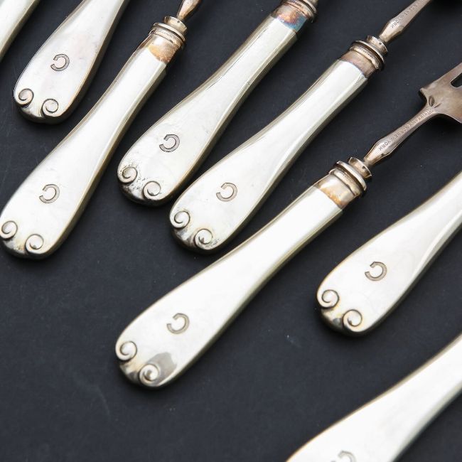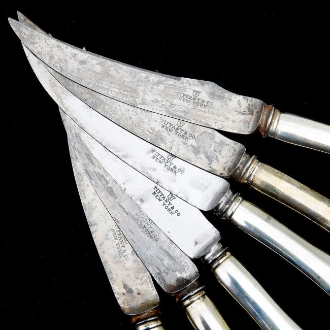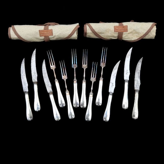 for six settings, the handles marked 'Sterling, Tiffany & Co', with engraved letter 'G', the stainless steel blades and tines marked 'Tiffany & Co, New York', in their original Tiffany dust cloths (12)