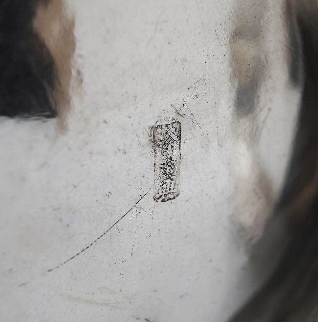 Chinese character marks, each relief decorated with five clawed dragons, to a planished finish, the handles modelled as bamboo, the bases engraved with a Greek key border (2)