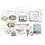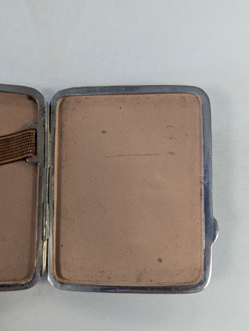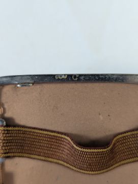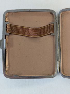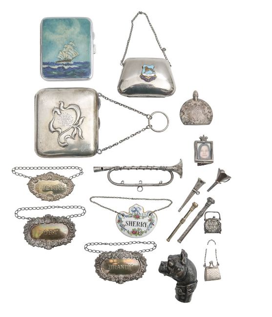 to include a miniature photograph frame, a scent bottle and funnel, marked Sterling, a card case painted with a galleon, two miniature purses, and another an unmarked trumpet, three decanter labels marked 'Port', 'Sherry' and 'Brandy', another Staffordshire porcelain example marked 'Sherry', and a metal cane handle modelled as a bulldog (qty.)