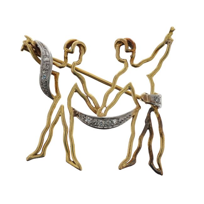 depicting the Gemini twins holding a diamond set ribbon with a brooch pin and bayonet clasp