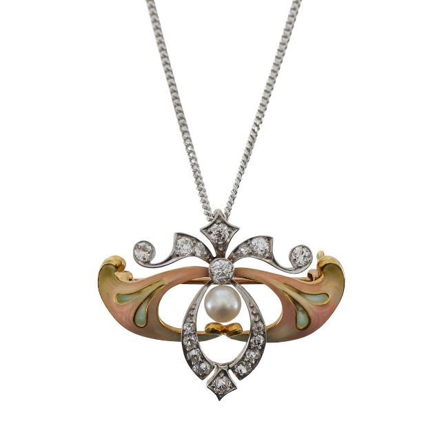 An Art Nouveau diamond, pearl and enamel pendant brooch