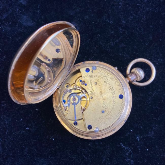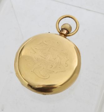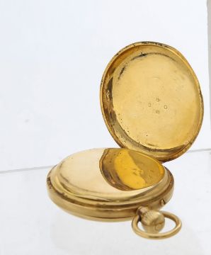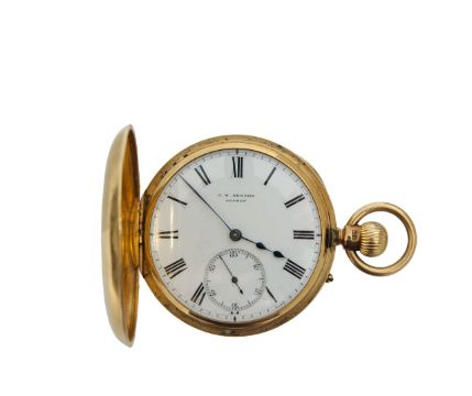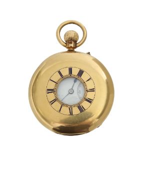 An 18ct gold Victorian key less half hunter pocket watch the enamel dial stamped J.W.Benson, London, with black Roman numerals, subsidiary seconds, blued steel hands, navy enamel Roman numerals to outer chapter ring, movement numbered 105486, with monogram to reverse of the case Dimensions: total weight approx. 95.3g., diameter of dial approx. 38mmCondition: Winds, ticks, Dust cover and inside case stamped 18ct. Small crack to enamel dial around 5 o'clock. Monogram rubbed. In fair condition.