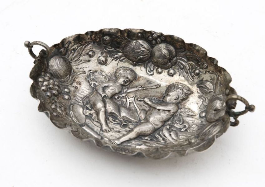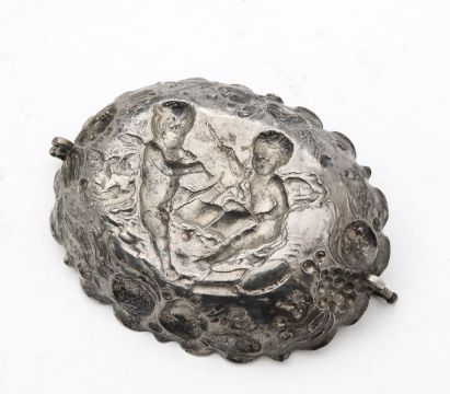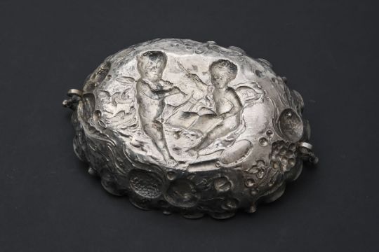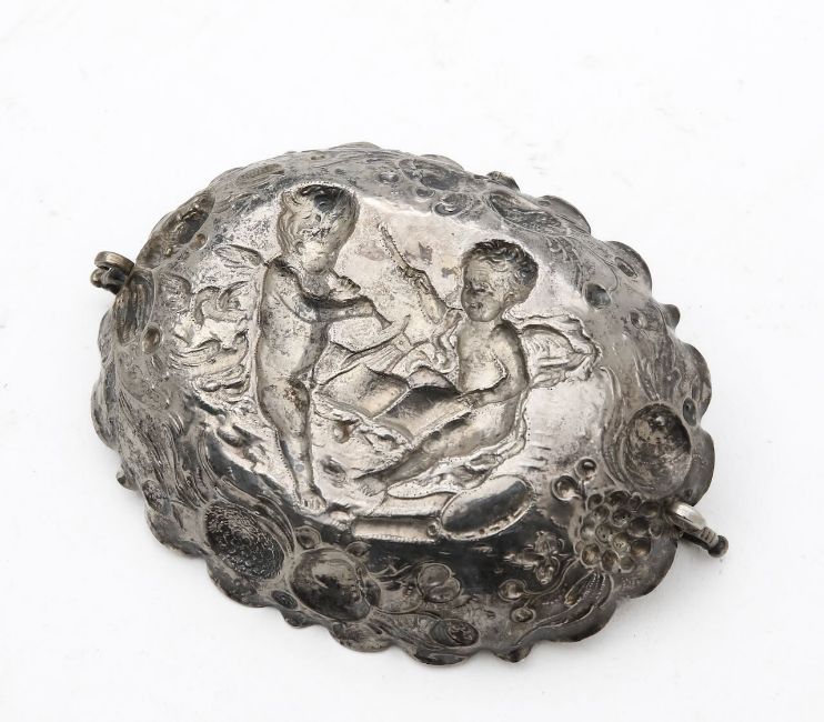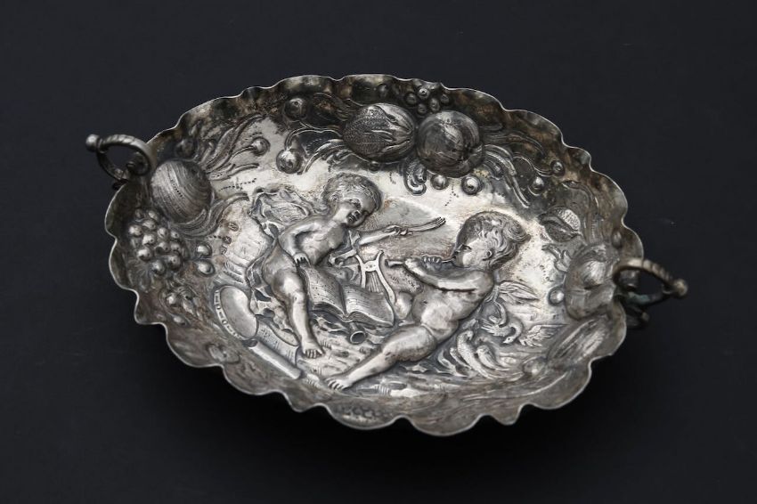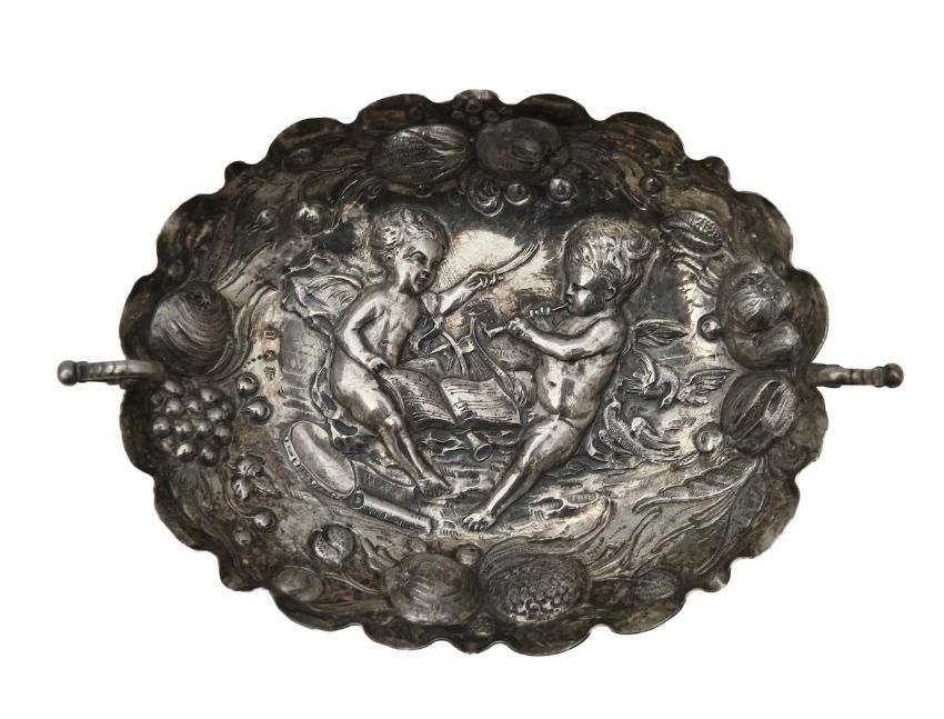 marked N X I3, possibly for Nuremberg, German, relief decorated with putti playing musical instruments, to a border of fruit