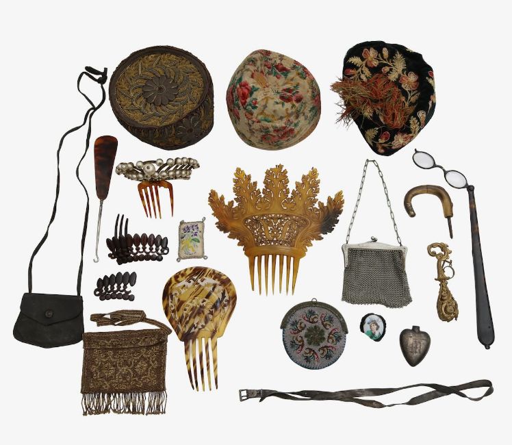 comprising three embroidered smoking caps, a large horn pierced hair comb, another adorned with faux pearls, a beaded bag with tassel decoration, a silver heart shaped perfume bottle, gilt metal posy holder, a beaded bag with floral decoration, faux tortoiseshell lorgnettes etc..., a/f